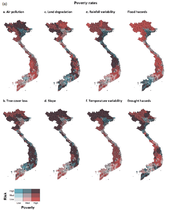 Despite complex interlinkages, insights into the multifaceted relationship between environmental risks and poverty can be gained through an analysis of different risks across space, time and scale within a single context using consistent methods. Combining geo-spatial data on eight environmental risks and household survey data from 2010–2014 for the case study of Vietnam, this paper shows: (i) at the district level, the incidence of poverty is higher in high risk areas, (ii) at the household level, poorer households face higher environmental risks, (iii) for some risks the relationship with household-level consumption varies between rural and urban areas, and (iv) environmental risks explain consumption differences between households, but less so changes over time. While altogether these analyses cannot establish a causal relationship between environmental risks and poverty, they do indicate that Vietnam’s poor are disproportionally exposed. Given growing pressures due to climate change, addressing such risks should be a focus of poverty reduction efforts.
